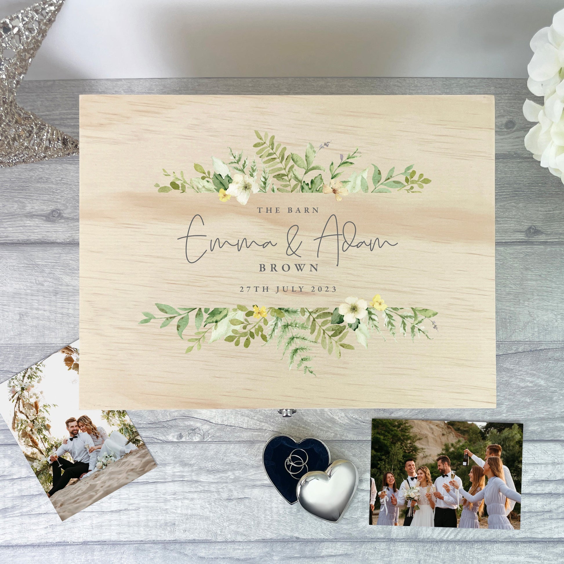 Personalised Wooden Green & Yellow Floral Wedding Keepsake Memory Box - 5 Sizes (16cm | 20cm | 26cm | 30cm | 36cm)