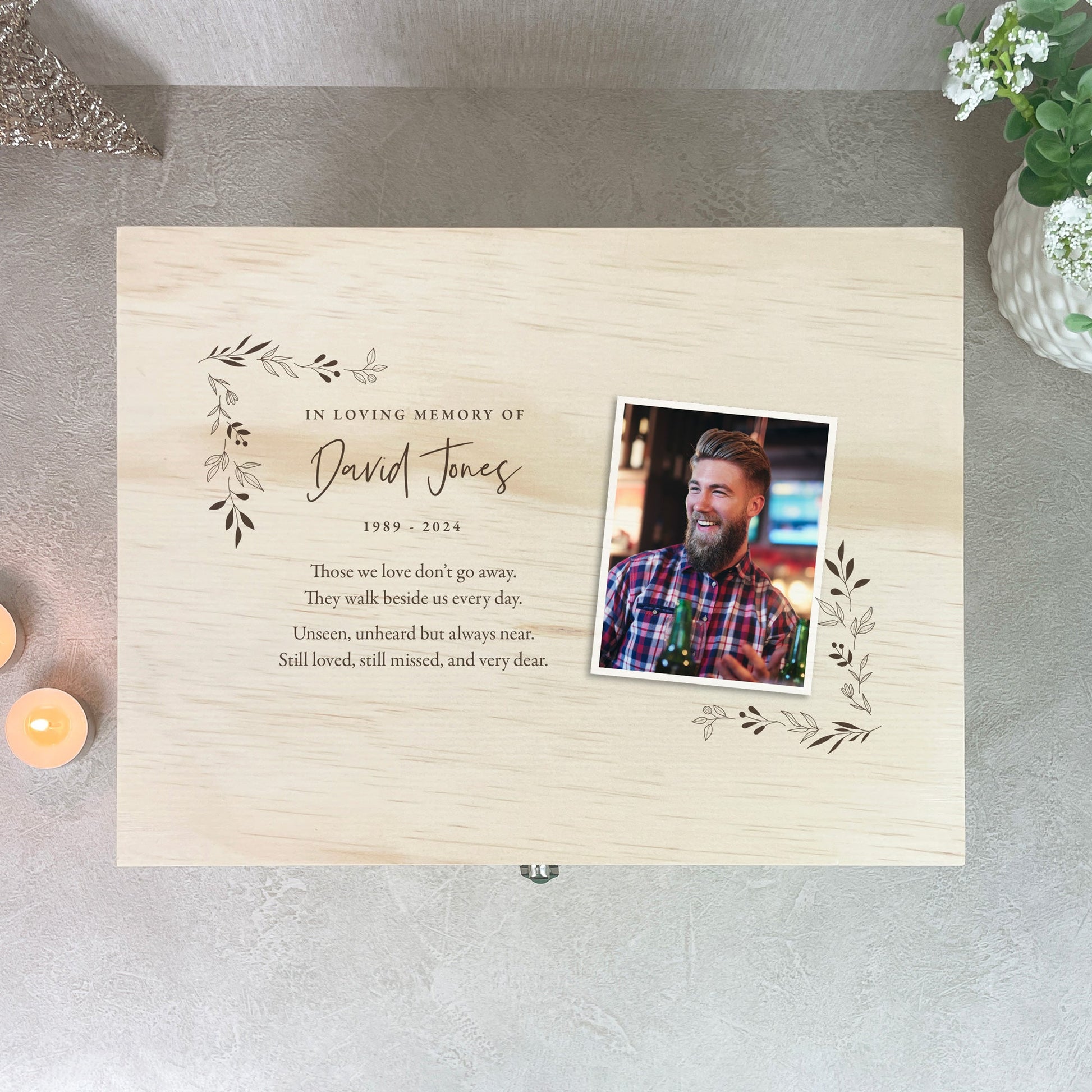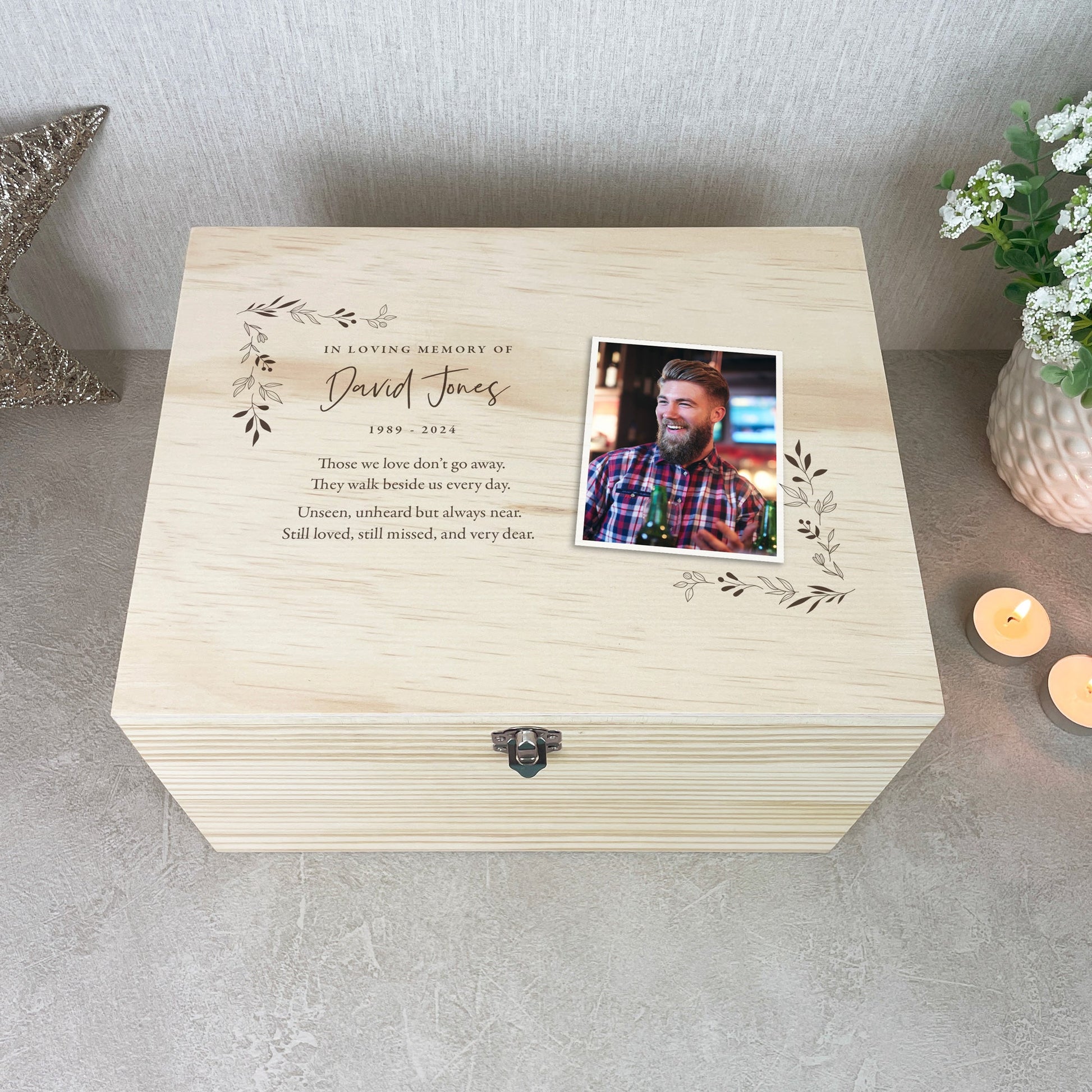 Our large wooden memory boxes are ideal for keeping precious memories safe. Add a personal touch by including your favourite photo of a loved one.