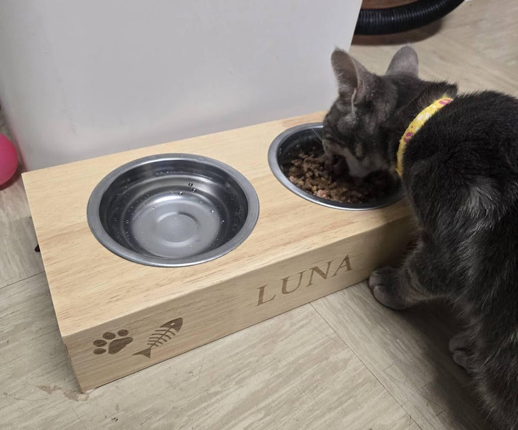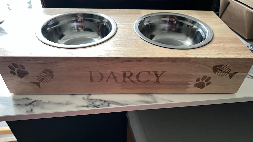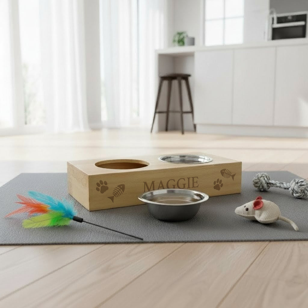 Add your cat’s name which will be beautifully laser-engraved into the wooden stand for a lasting, premium finish.