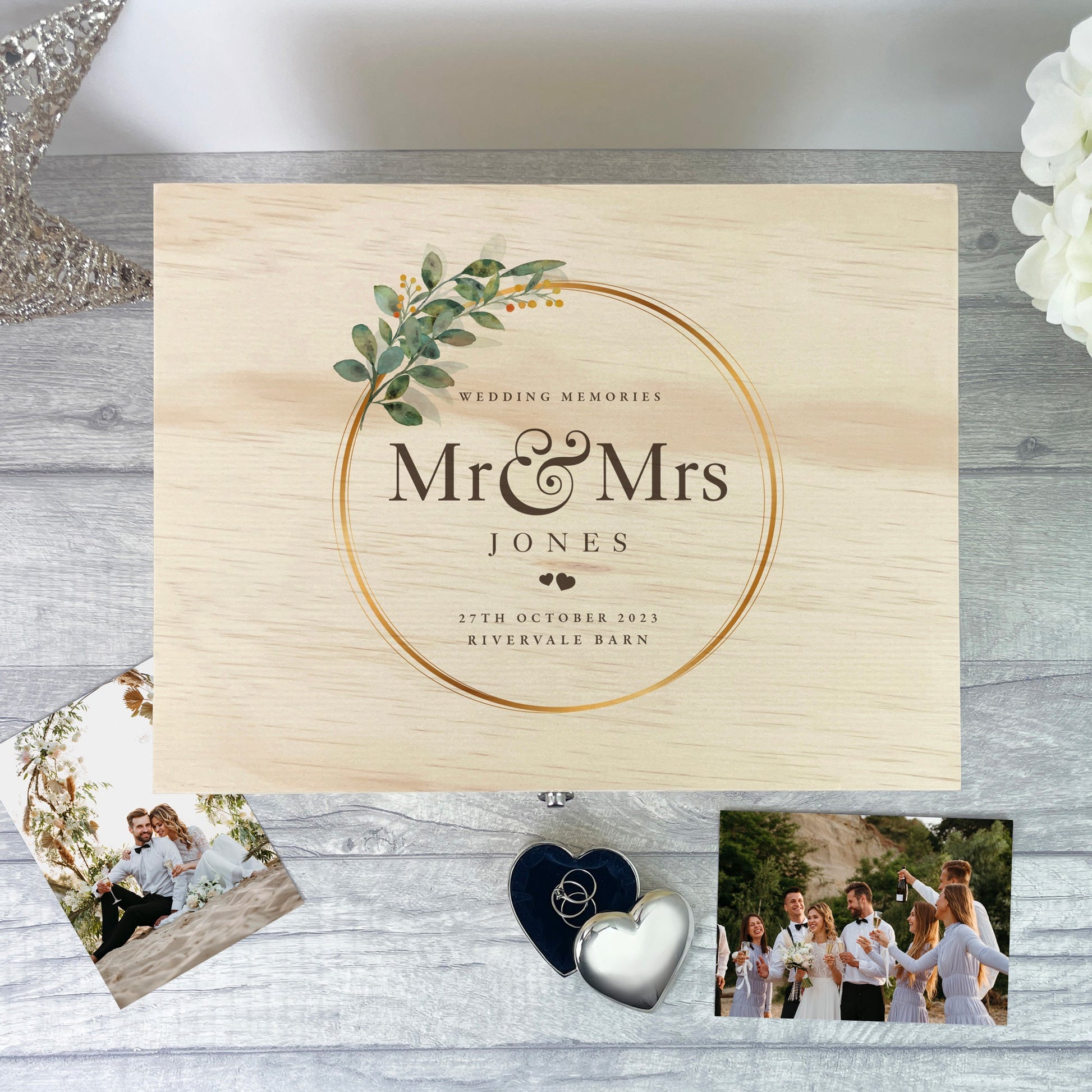 This beautiful wooden wedding memory box, featuring a gold wreath with a leaf design, is a perfect wedding day or anniversary gift for a couple. Personalise it with your own details.