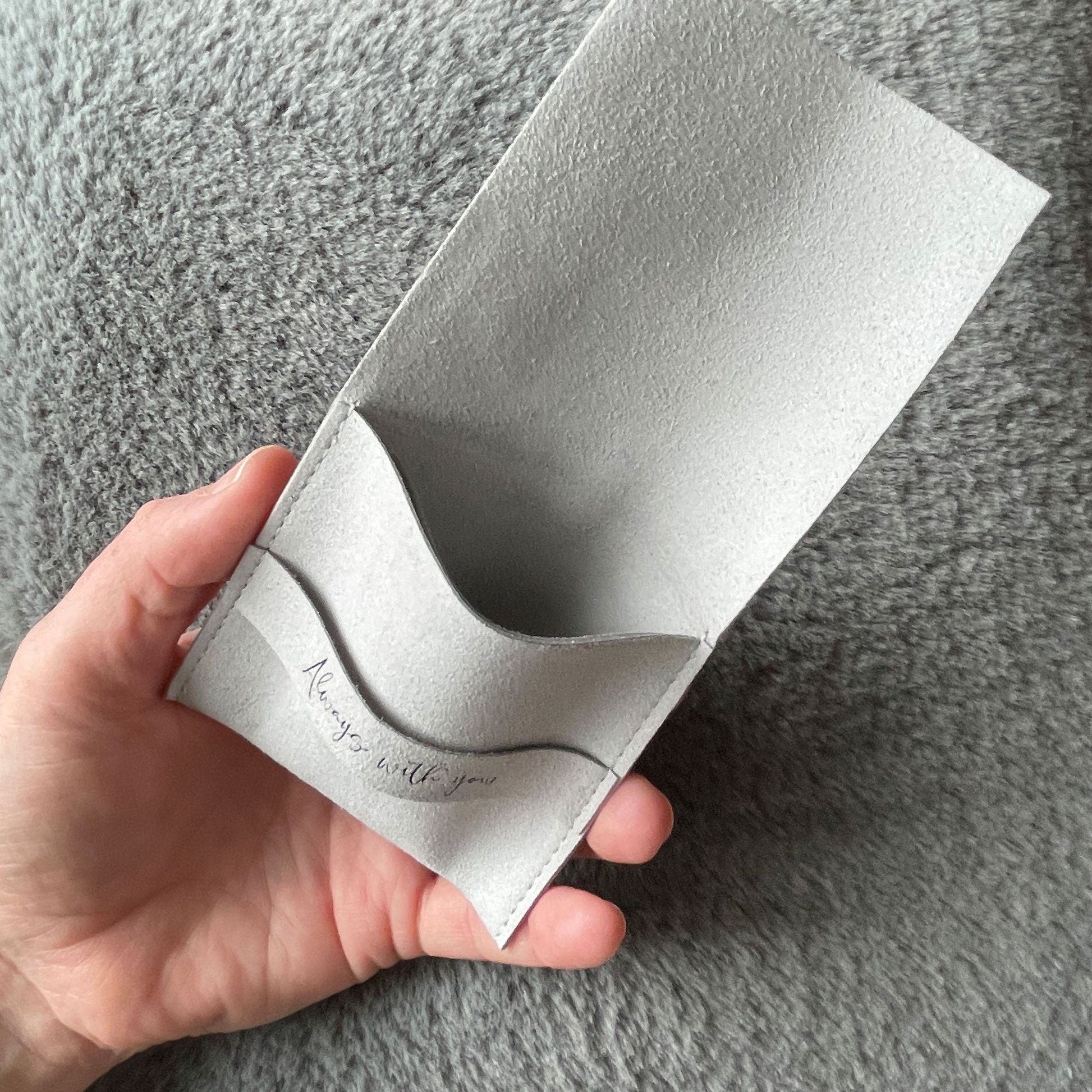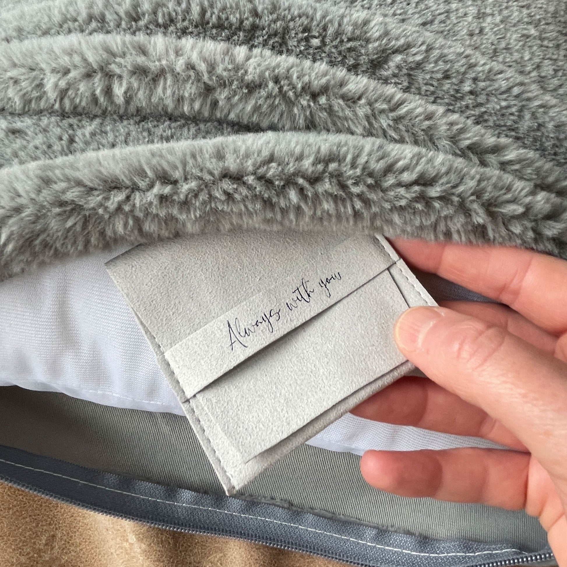Inside the cushion, there is a light grey bag that can hold a small amount of cremation ashes inside a sealed plastic bag. *Please do not overfill the plastic bag to prevent it from splitting.*
