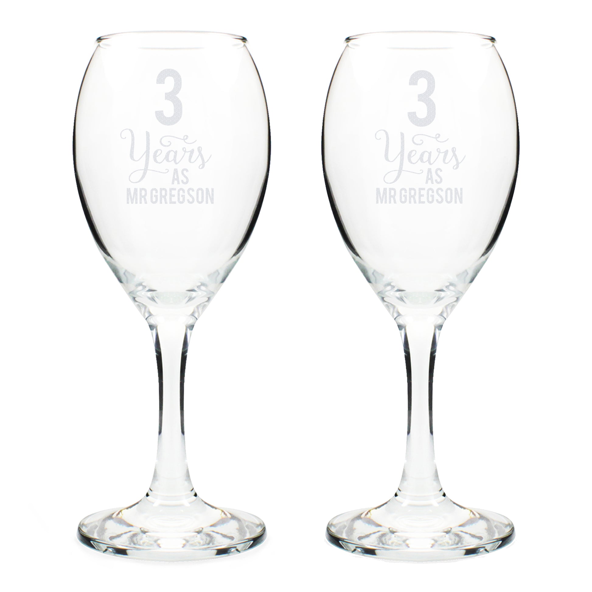 Both of these personalised Years As... Wine Glasses can be personalised with a number to appear on both glasses and two names up to 15 characters each, with one name appearing on each glass. Please enter Mr/Mrs if required.