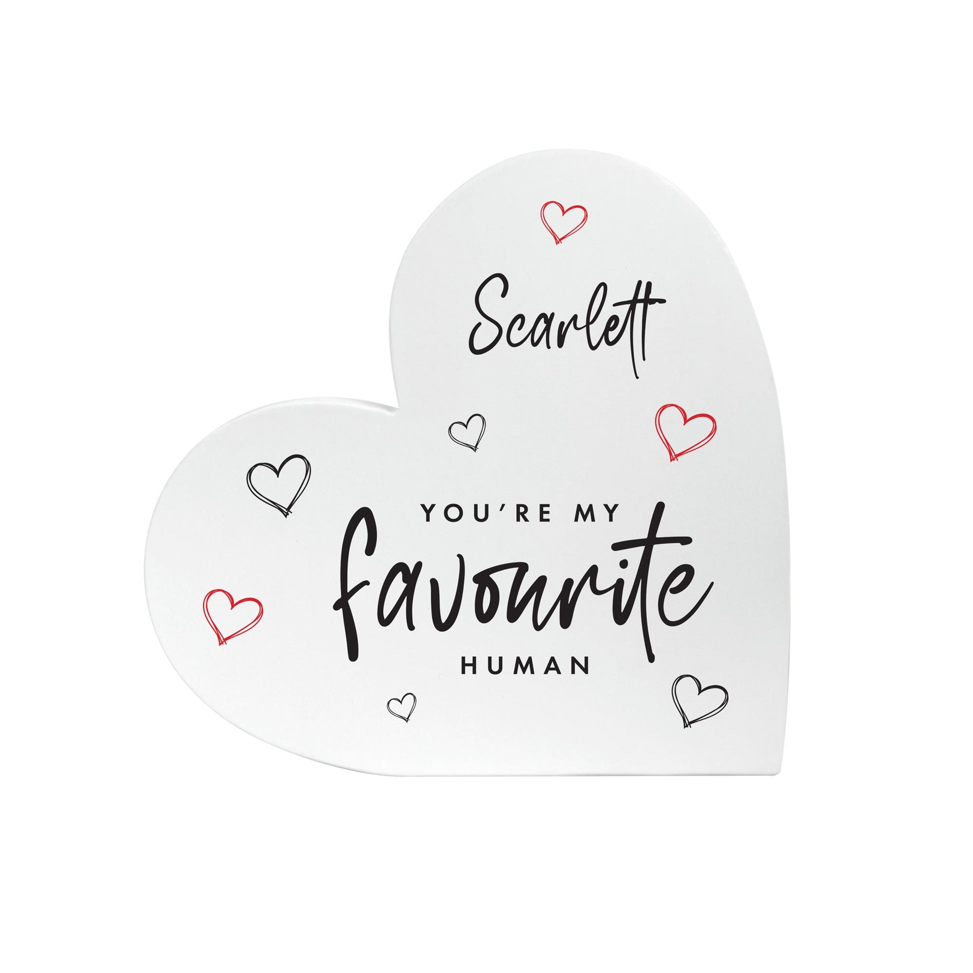 Each natural pine wood heart is hand-painted white and features a decorative array of black and red sketched love hearts and the phrase "You're my favourite human".