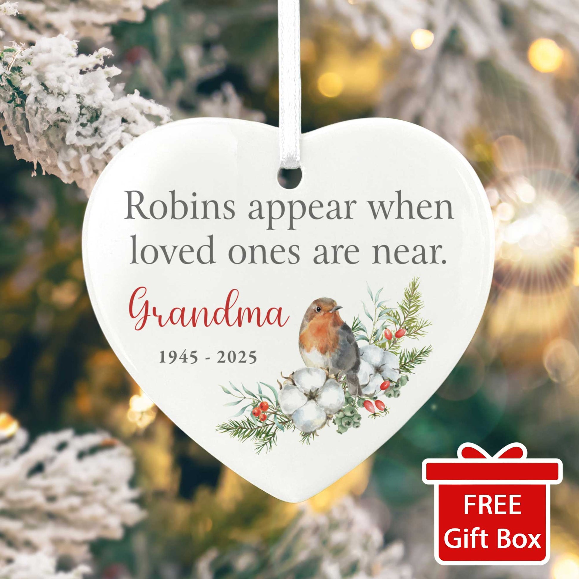 Honour a cherished loved one this Christmas with a personalised memorial decoration to hang on your tree. Featuring a delicate robin alongside the touching words, "Robins appear when loved ones are near," this ornament provides a meaningful remembrance within your festive décor. Personalise it with a name and dates to create a truly sentimental keepsake.