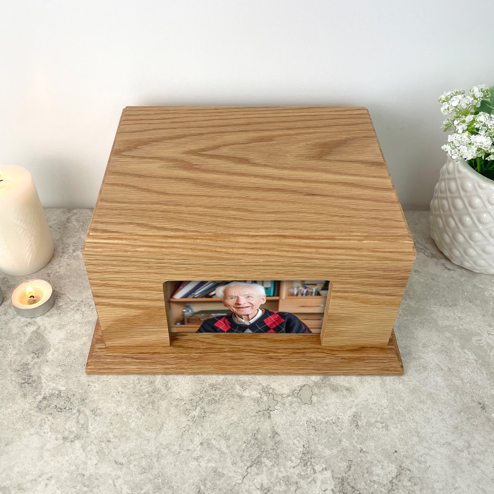 Create a lasting and meaningful tribute with this beautifully crafted solid oak urn with photo holder, designed to honour the memory of a loved one with dignity and warmth. Made from premium solid oak, this memorial urn showcases the natural beauty of real wood grain, offering a timeless keepsake that blends seamlessly into any home décor.