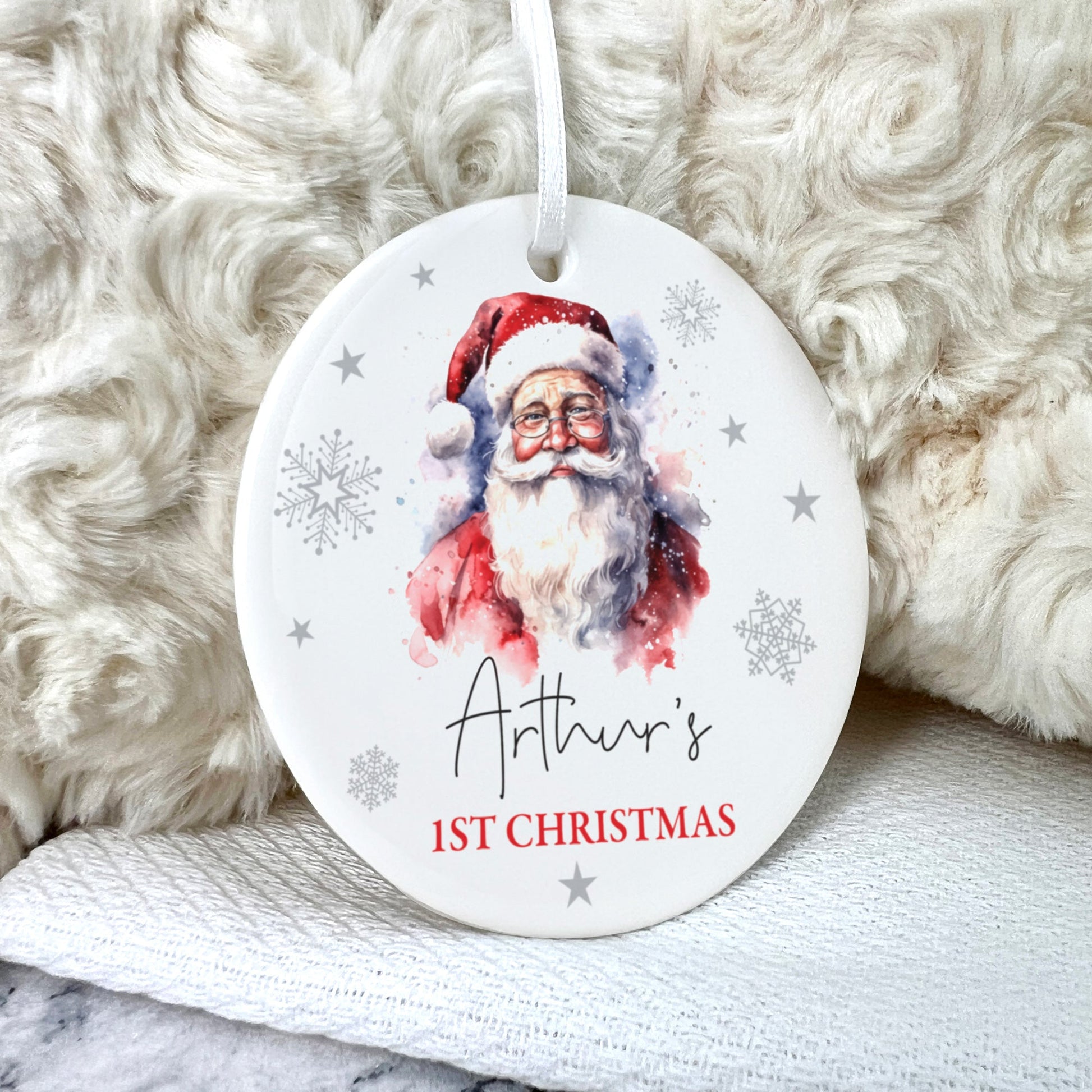 This delightful traditional Santa ceramic ornament from our beloved Christmas collection is ideal for decorating your tree every festive season. Customize it with any message of up to two lines, making it a meaningful gift. It arrives carefully packaged in a white gift box with foam padding, perfect for giving a special present to new parents this holiday.