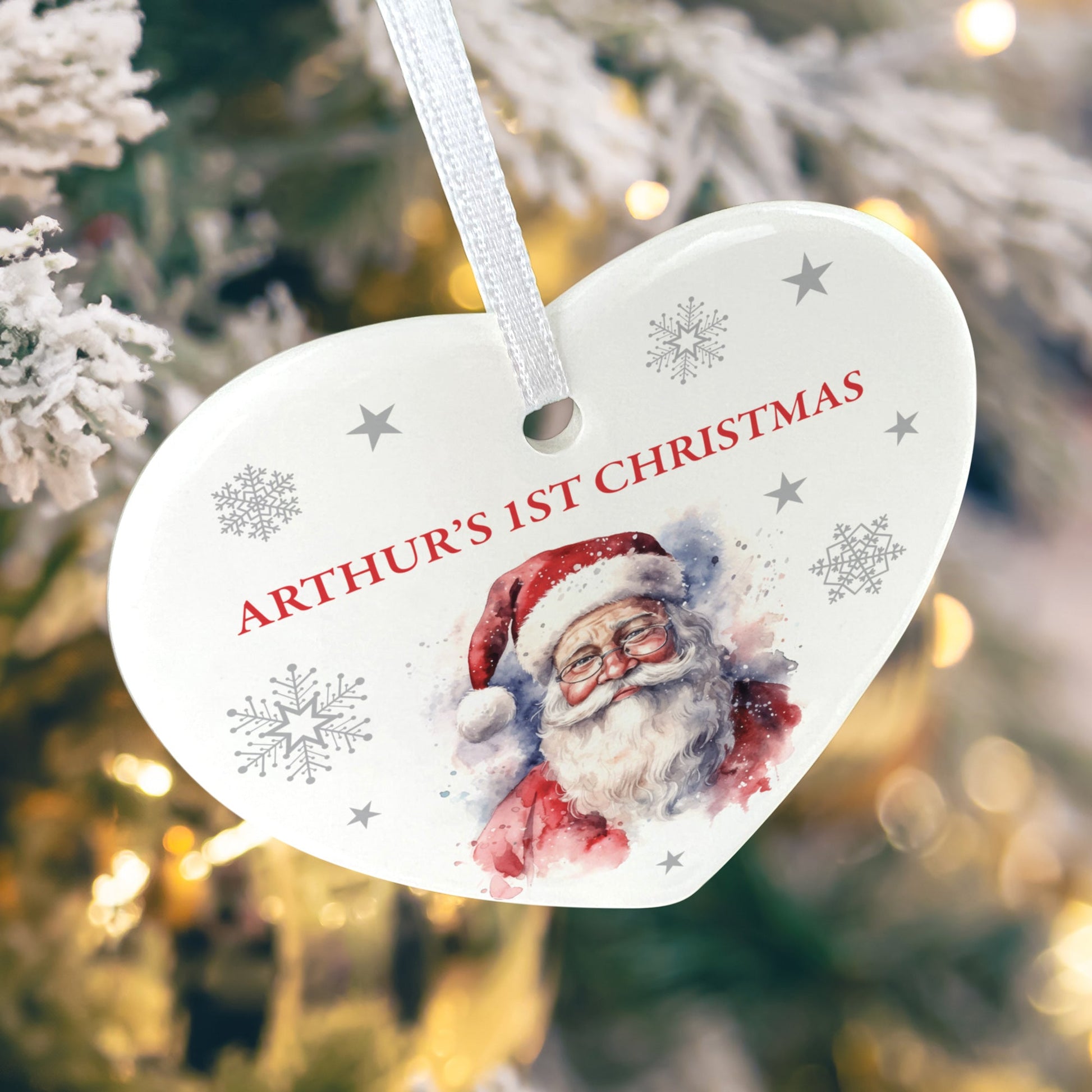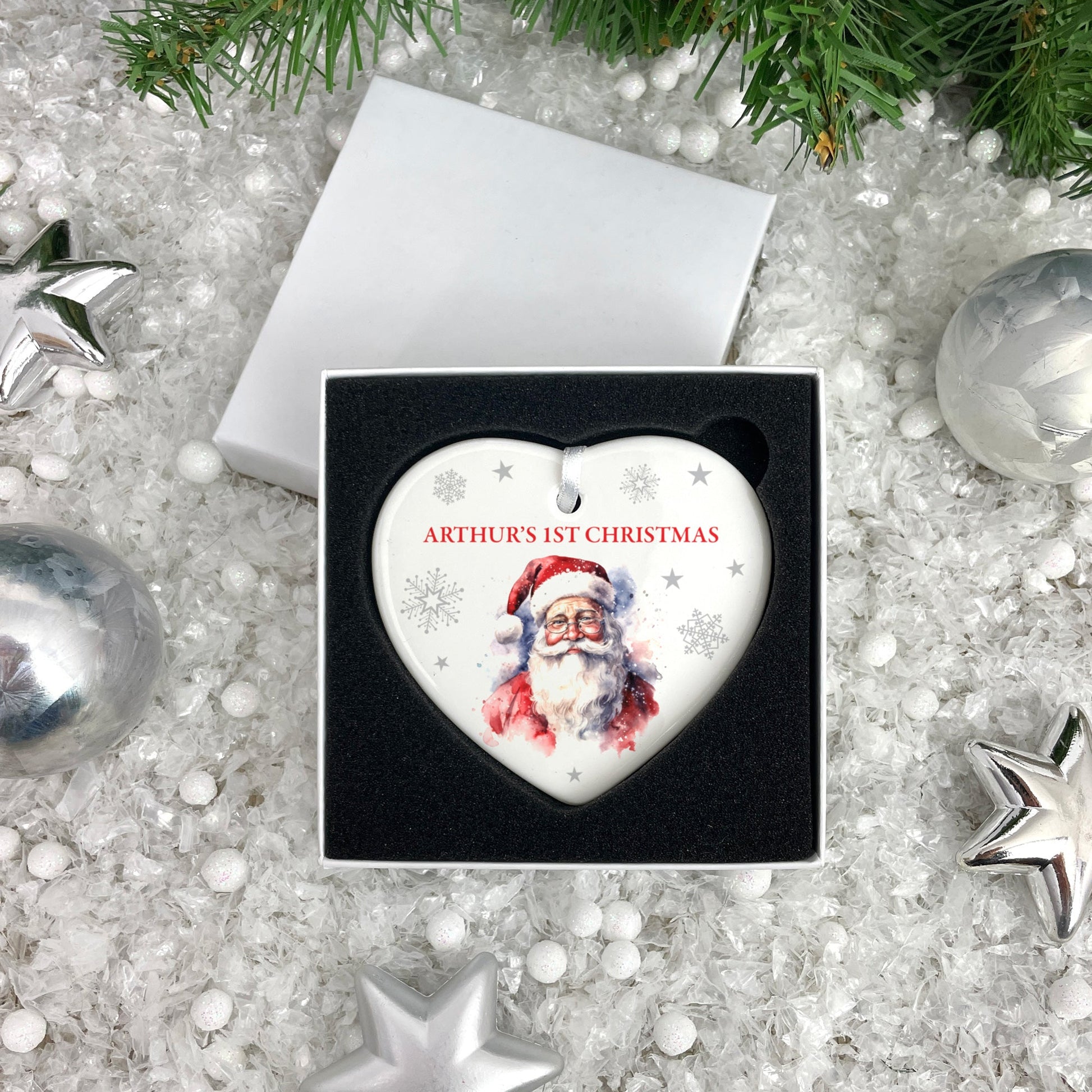 This delightful traditional Santa ceramic ornament from our beloved Christmas collection is ideal for decorating your tree every year. Customised with your chosen message, it arrives securely packed in a white gift box with foam cushioning, making it a thoughtful gift for new parents this festive season. Add your personal message to create a special Christmas keepsake.
